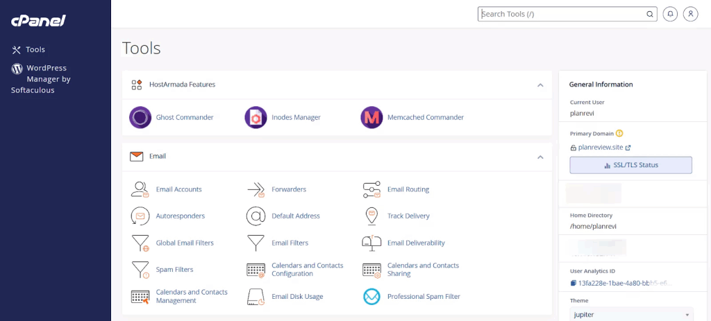 From the management dashboard, I logged into cPanel, where I could easily access the WordPress Manager (via Softaculous) and view key account details such as SSL status, IP address, and disk usage.