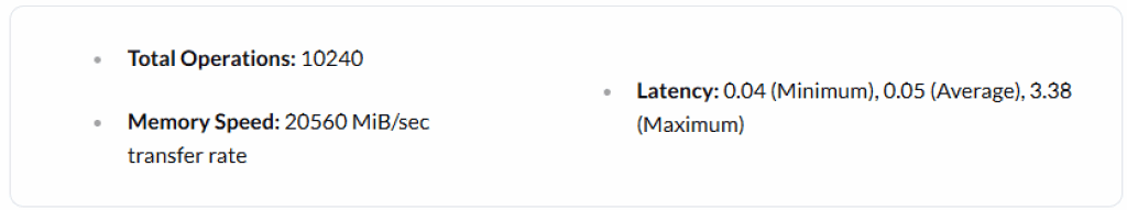 These results demonstrate that HostArmada’s VPS server provides robust memory performance, making it a reliable choice for applications requiring quick data access and processing.