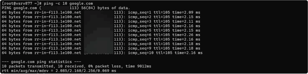 I conducted a ping test targeting Google’s servers to evaluate the network performance of HostArmada’s VPS hosting.