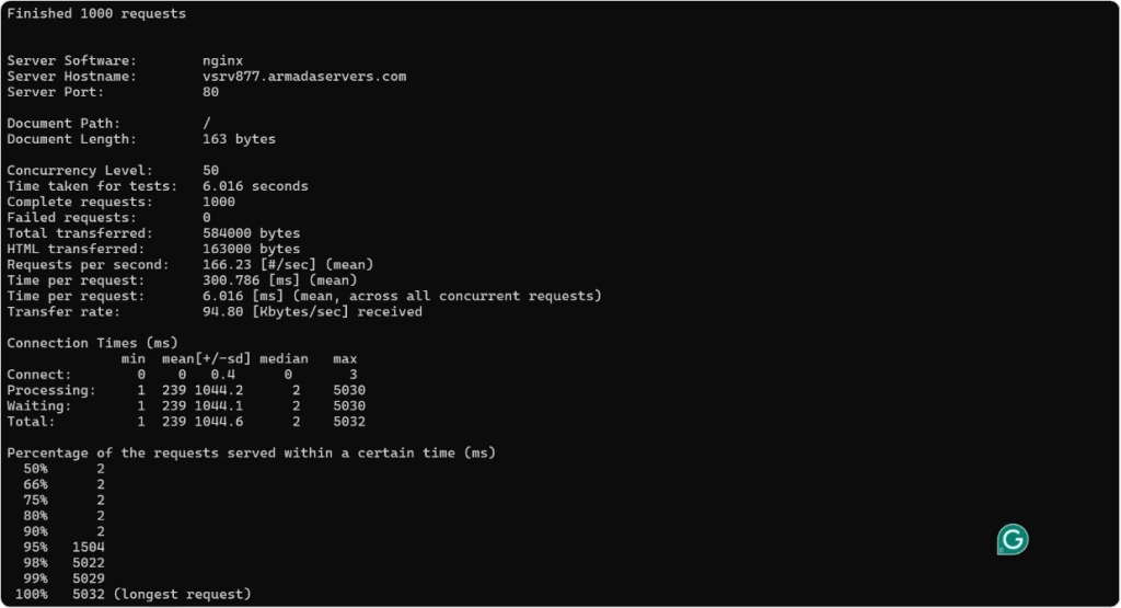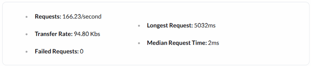 To assess the server’s stability, I ran a stress test using Apache Benchmark (ab).