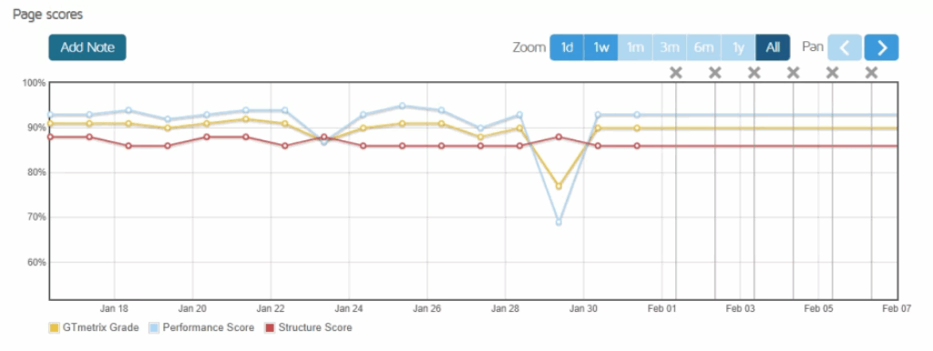 I extended the performance evaluation over two weeks using GTmetrix. Throughout this period, HostArmada maintained steady and reliable performance, averaging a 91% score. The only outlier was a sharp drop to 77%, which likely reflected a brief server slowdown caused by congestion.