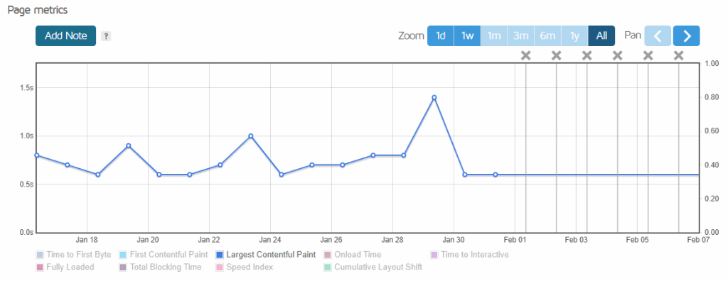 For the majority of the testing period, HostArmada’s server maintained a Largest Contentful Paint (LCP) of under one second, ensuring fast content loading for users under normal conditions. On average, the LCP measured around 750ms, with a single outlier at 1.38s, likely caused by heavier page elements or temporary delays in server response.