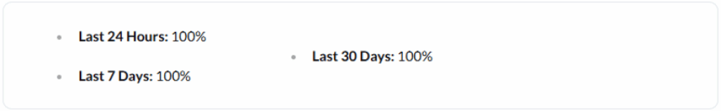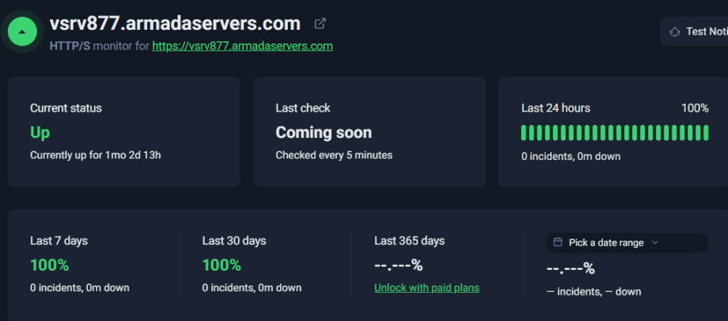 I set up a 30-day uptime monitor using Uptime Robot, and over the entire 30-day period, HostArmada’s server maintained a 100% uptime rate, meaning there were zero recorded incidents of downtime.