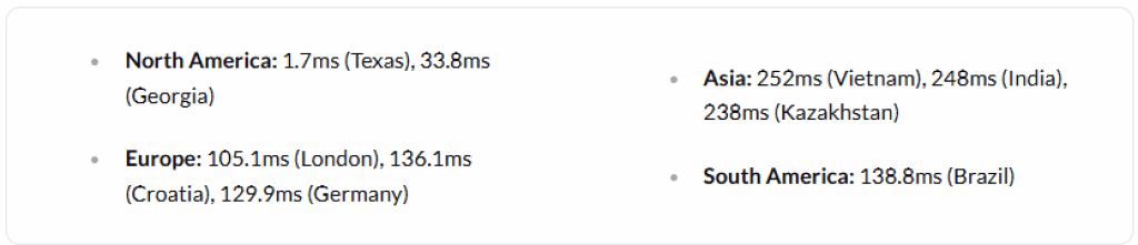In other regions, while the response times were slightly higher, they remained well within a reasonable and acceptable range for most hosting needs. Adding a CDN can improve performance for international visitors in high-latency regions like Asia and South America.