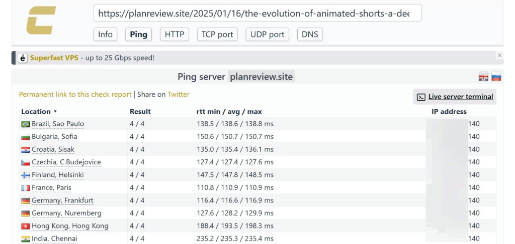 Additionally, I used Check Host, a tool designed to test ping and response times from various locations around the globe, to evaluate the network performance of HostArmada’s shared hosting.