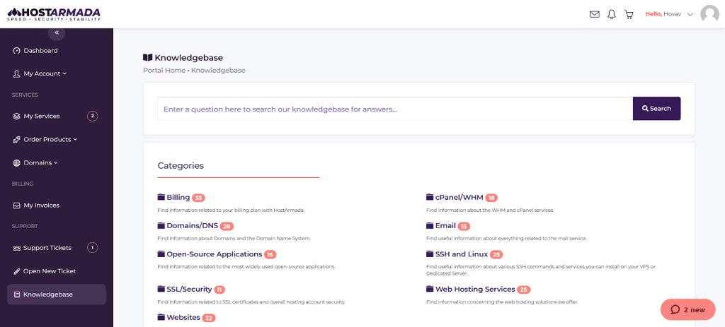 The HostArmada knowledge base is easily accessible from the user dashboard, and I found it to be well-organized and clearly presented.