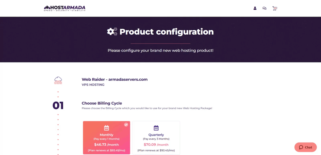 Choose between monthly or quarterly billing cycles first, then select your data center location and server features.